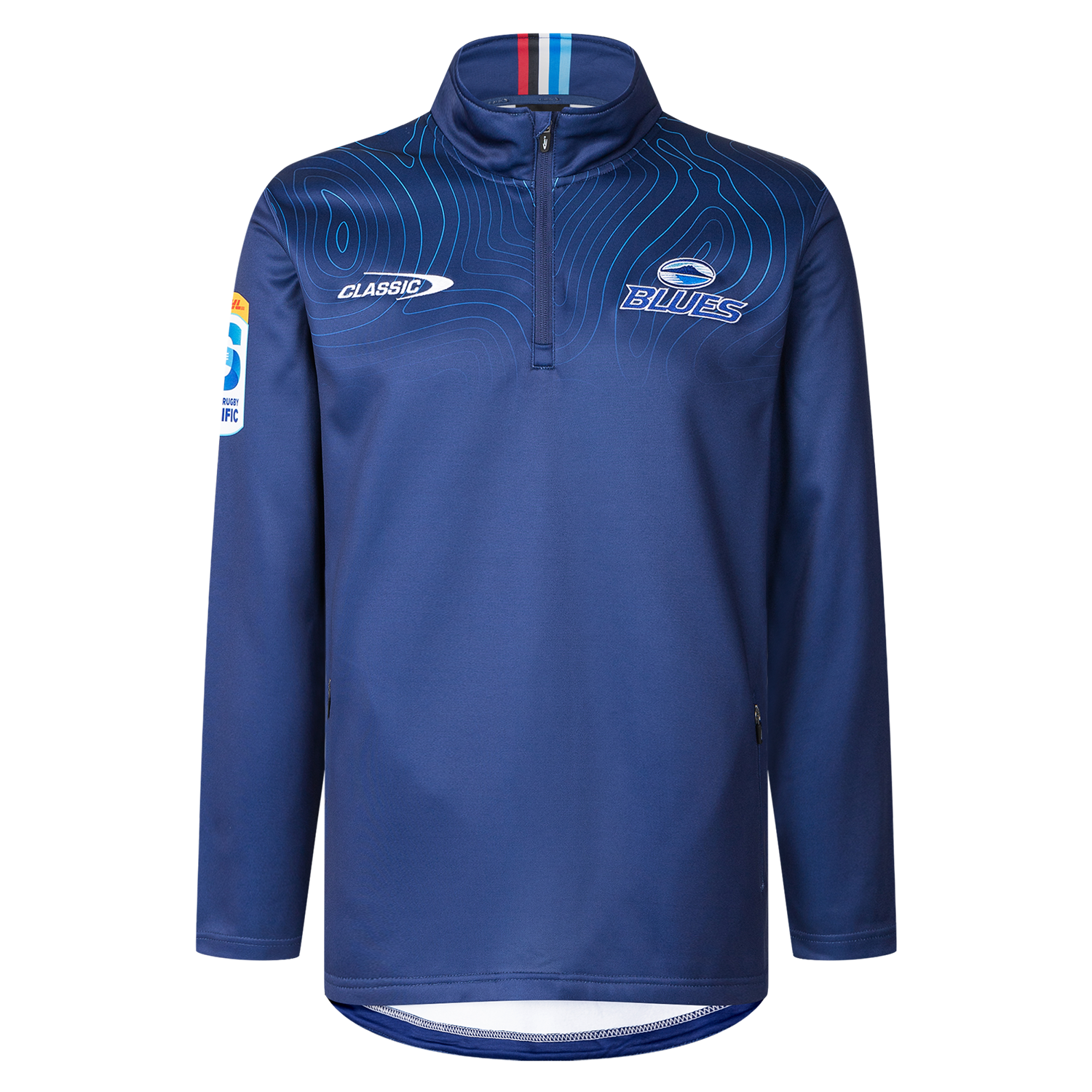 Blues Replica 1/4 Zip Training Fleece in team colours. Polyester performance fabrication. Club logo on left chest with sponsor logos on chest, back & sleeve, contrast piping details with stand up collar.