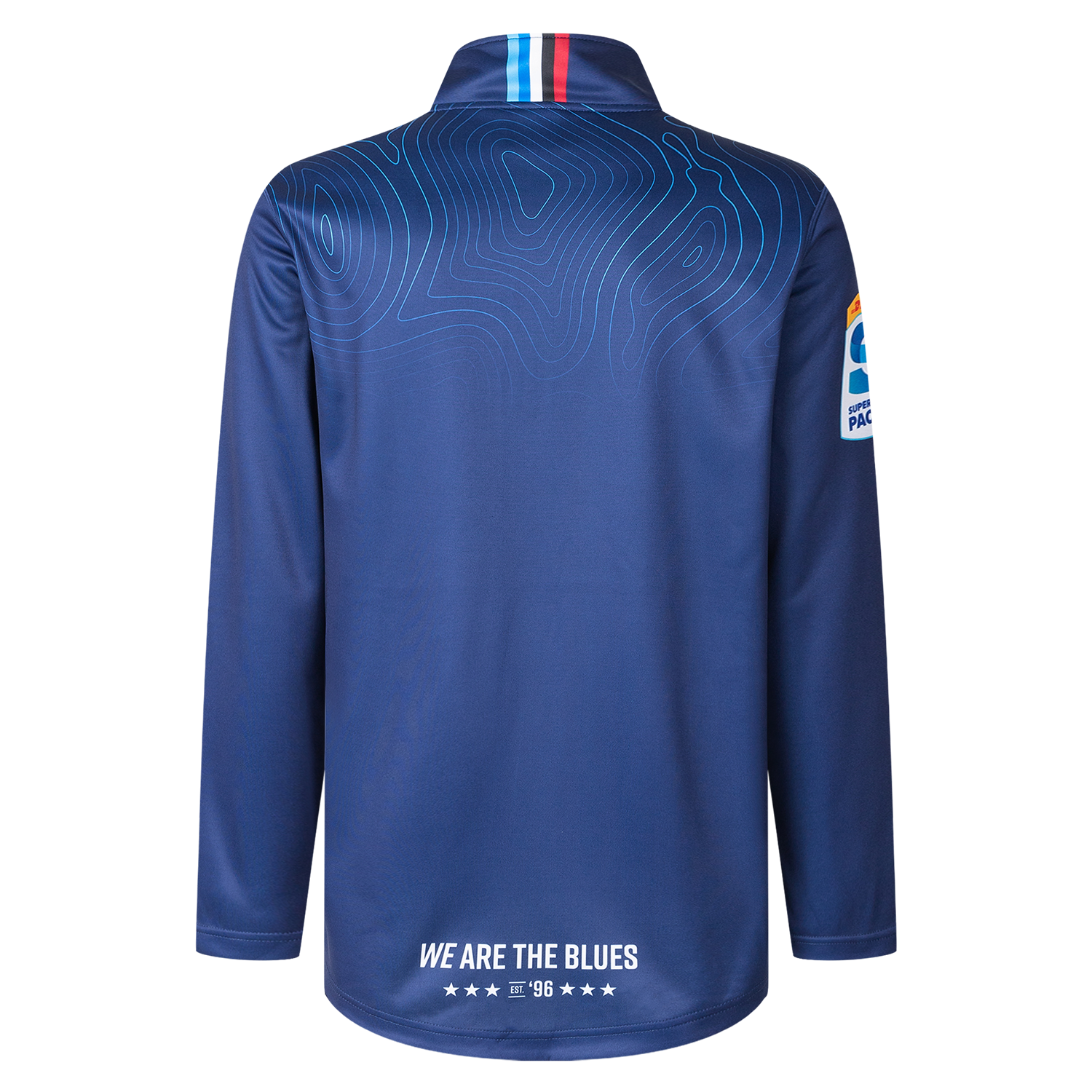 The theme of the Blues training kit draws inspiration from the 'four tides' that surround the Blues region. The wave motif is presented in a stylised form, creating a dynamic, looping design. When two or more players wear the kit side-by-side, the patterns interconnect to form an extended wave, symbolising the concept of unity and the ethos of 'together stronger.' The white accents at the top of the design evoke the appearance of foam cresting on a breaking wave, further reinforcing the maritime theme. Additionally, this season the maroon elements represent and pay homage to the North Harbour region, adding a sense of place and pride to the design.