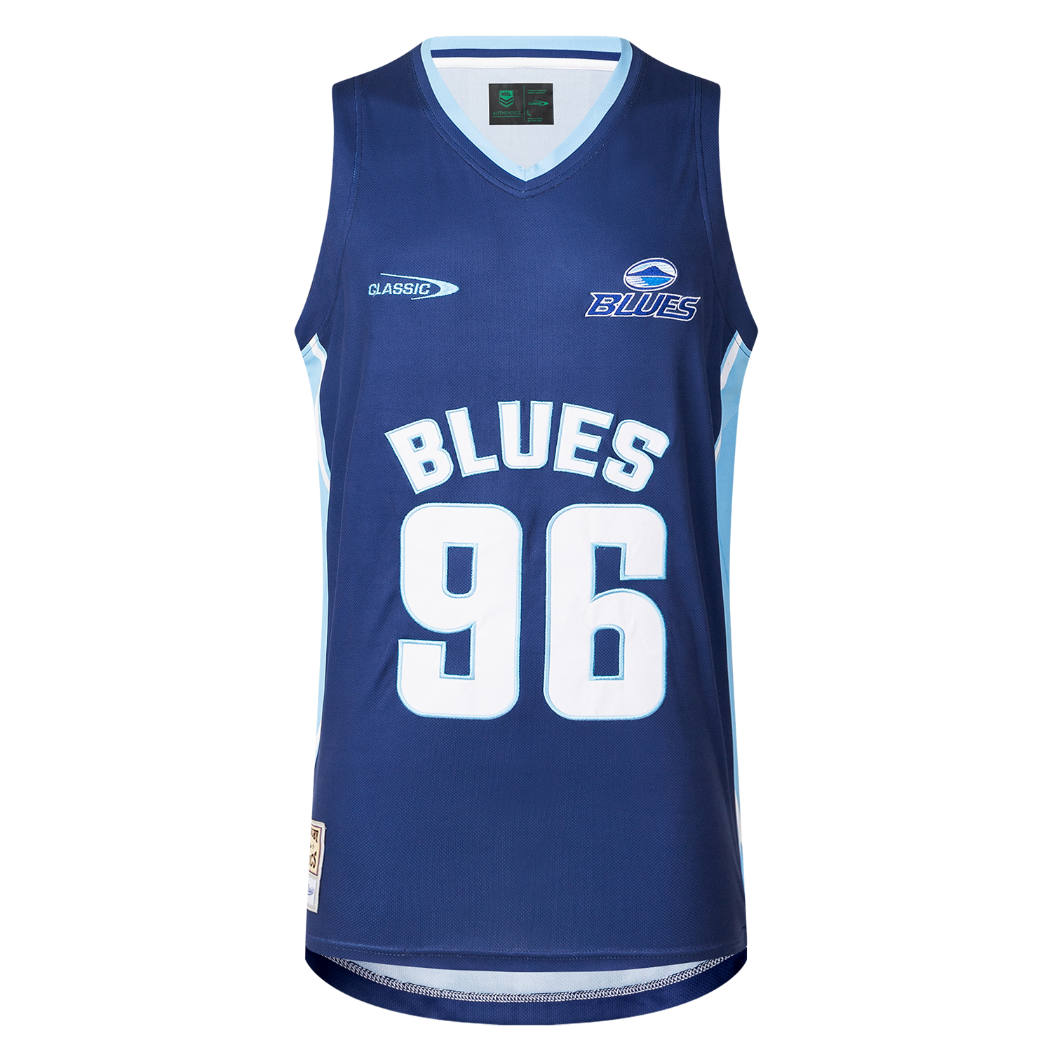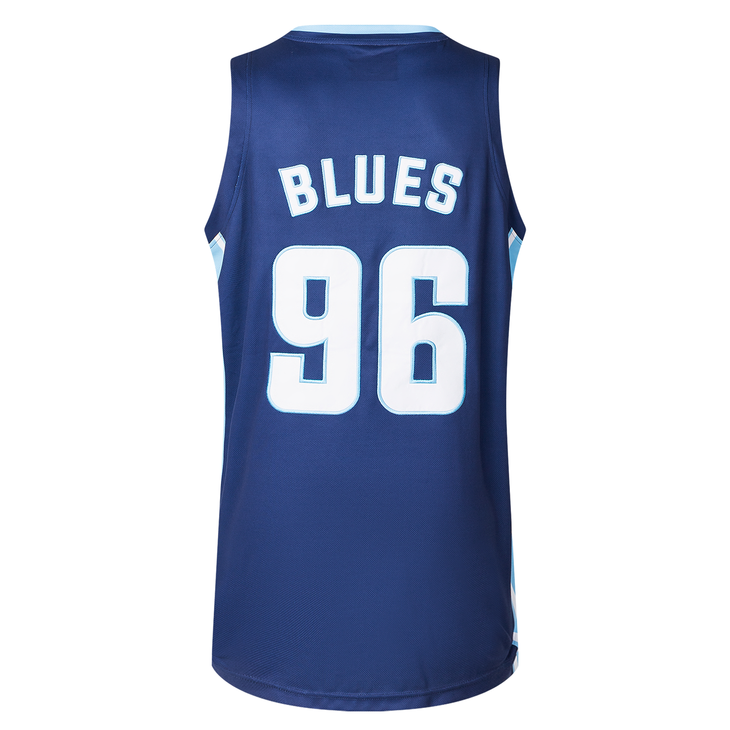Blues basketball-style singlet. Polyester performance fabrication. Quick dry and doesn't require ironing. Polyester moisture wicking fabric with printed numbers and embroidery logos. Great for training or general wear.