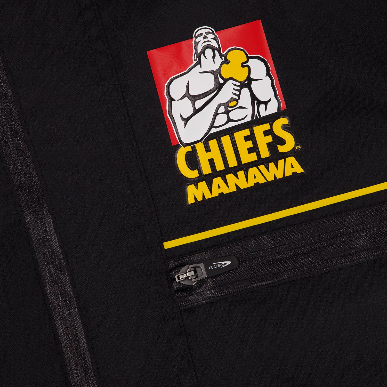 Chiefs Manawa Replica Pro Wet Weather Jacket. 100% Polyester ripstop, 3000mm waterproof and 5000 breathable. Centre front waterproof zipper and side pockets with rubber velcro wrist adjustment. Printed club logo on left chest.