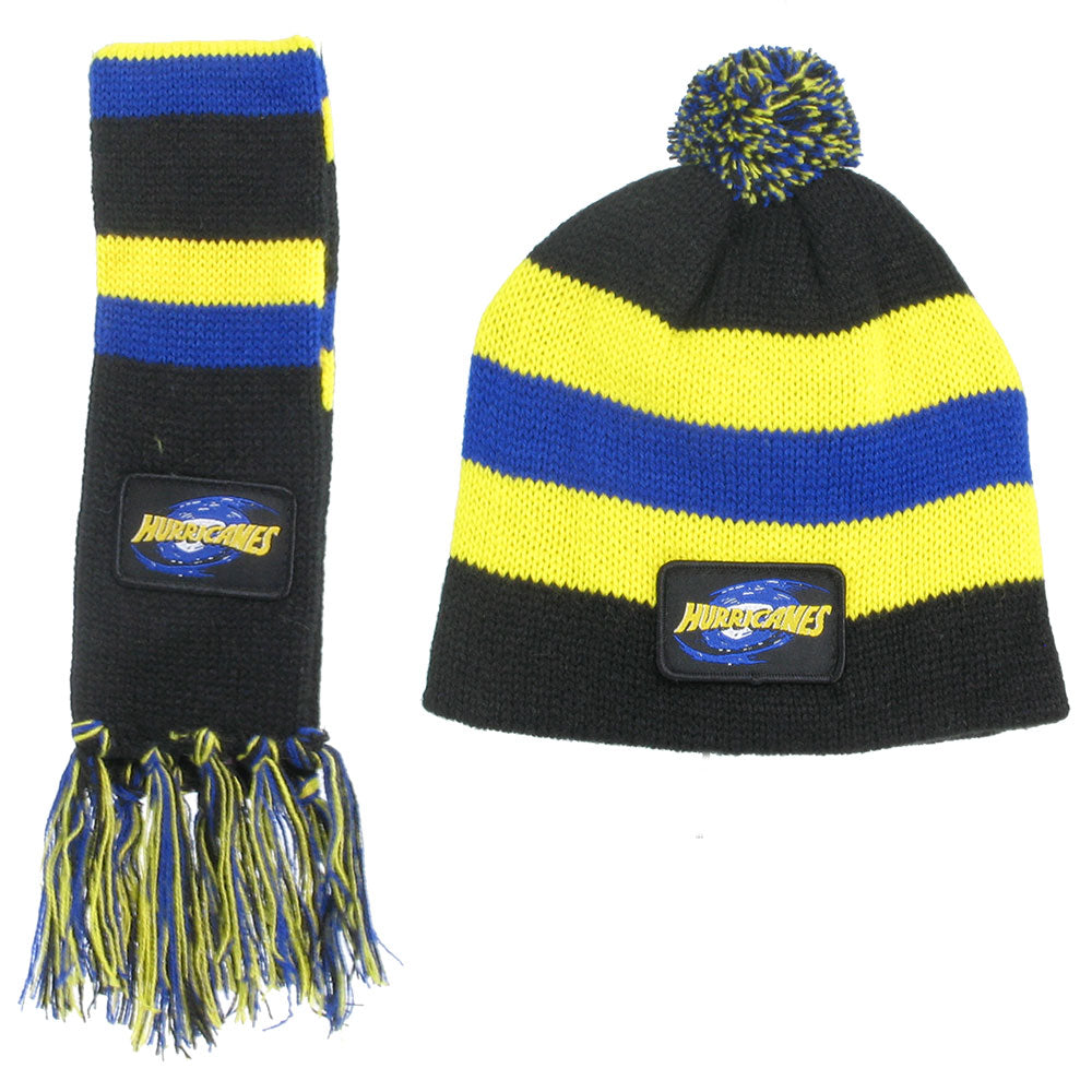 Support the Hurricanes rugby team with this infant acrylic knit beanie & scarf combo. Knitted stripe design with tassels and pom pom beanie.